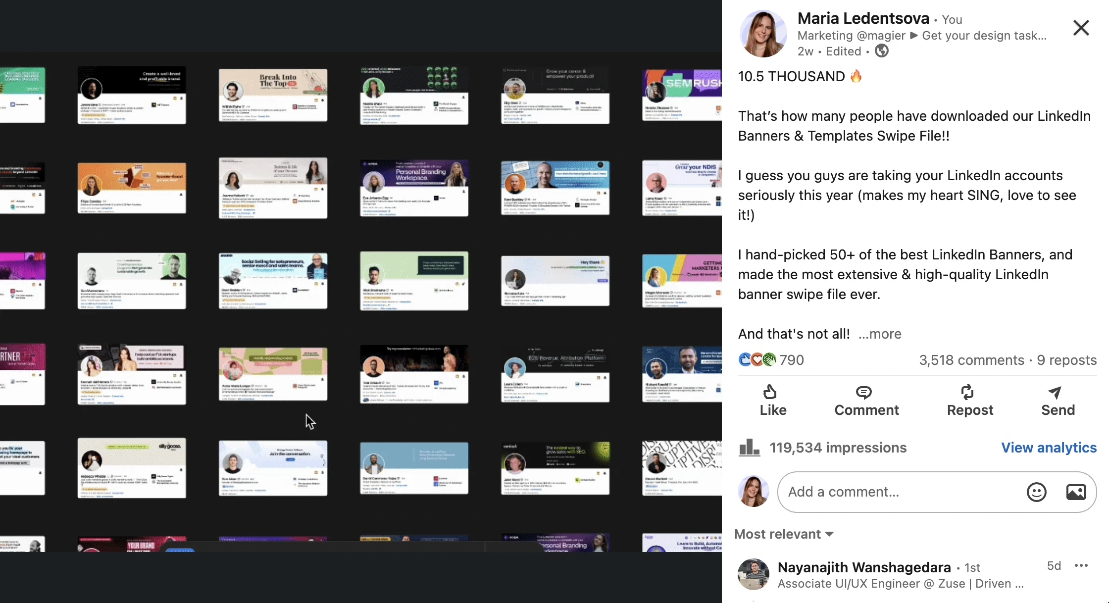 For some free resources we tested different hooks/ post copy or even alternative visuals. Some resources needed to be posted a second time before they took off. But after a few tests I understood what magier's audience responds to best.